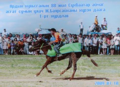 - Би ч улсад анх очиж байгаа нь л тэр л дээ. АХ-ын 90 жилийн ойгоор улсдаа тоосоо өргөнө гээд анх удаа улсад явж уралдсан юм. Миний Гоё хүрэн хязааланг гаргаад шүдлээд явуулчихсанаасаа хойш эргүүлж авчраад цаг шахуу болгож байгаад сэрвээний өндрийн хэмжээгээр эрлийз гэдэг юм. Би ч ямар очиж чадах биш. Айхтар ч юм билээ, цагдаа нар намайг барьж авчихаад оруулахгүй. Хэзээ хойно нь жийптэй хүн авч яваад тавьсан. Тэгээд 340 гаруй хязаалангаас есөөр оруулсан даа. Би ч бухимдахдаа “Миний хүрэн адууг өнөөдөр та нар хавчиж хасаж болно, маргааш дахиад өөр адуу ордог юм шүү, та нар чадалтай бол хасаарай гэж байсан.” Архангайн бүсэд хөл нь биш байхаар нь энд ирж орхичихоод, зээрд азаргынхаа уяаг Улаантайгаа тааруулъя гээд очсон юм. Архангайд Тайван зээрд аман хүзүүдсэн. Миний хол гарсан нь улсдаа нэг, Архангай, Хэнтий, Дорнодын бүсэд нэг нэг уралдлаа даа.