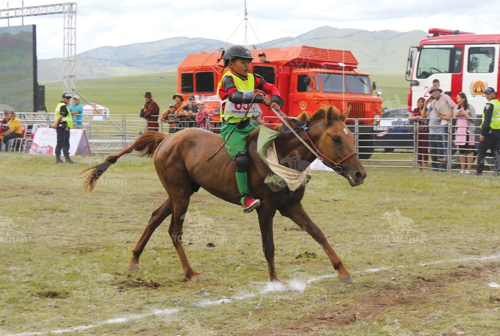 13. Булган аймгийн Хишиг-Өндөр сумын Алдарт уяач Н.Уламбаярын хээр халзан. Уралдаанч 630 дугаартай, есөн настай У.Элбэгдорж.